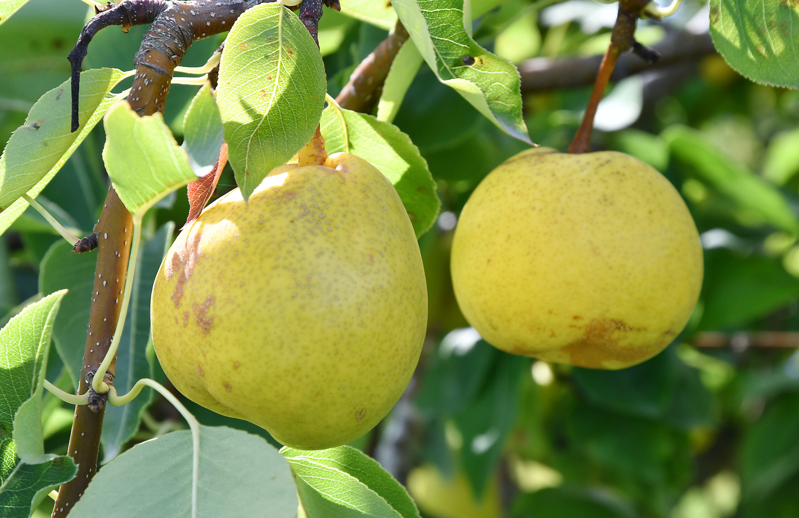 (Pyrus pyrifolia) The fruiting trees known as Asian Pears are native to East Asia. Asian Pears are usually round and have a delicious crispy flesh. Because of this, they are sometimes mistakenly called an “Apple Pear”. They have either yellow skin or russeted skin. The yellow skin varieties have thin skin and have a milder flavor. The russeted selections tend to have thicker skin and often a butterscotch like flavor.